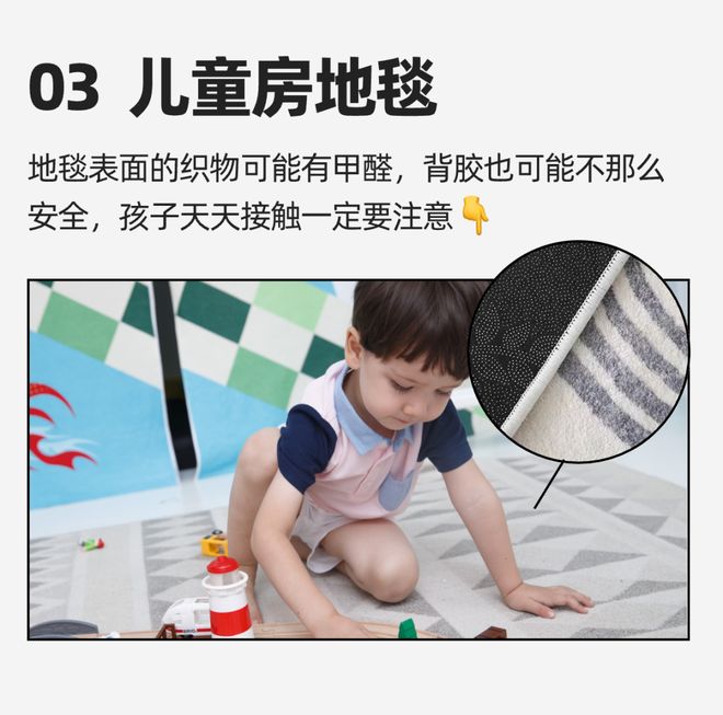 如果自己无法判断地毯背胶是什么材质,可以选择双面织物的地毯,通过水洗、强烈阳光暴晒、悬挂通风,来解决甲醛的隐患。
